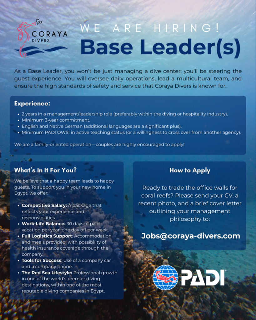 Coraya Divers is looking for passionate, organized, and driven Base Leaders to join our professional team in the stunning Red Sea. If you have a knack for management and a heart for the ocean, we want to hear from you.